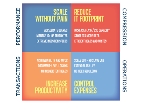 · Compresión optimizada para escritura consiguiendo hasta un 90% de reducción en HDD, esto permite reducir el número de servidores necesitados para almacenar una base de datos MongoDB