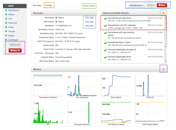 Ofrece un panel de control para conocer el estado del clúster. Y tiene la posibilidad de definir alertas para los servicios de Hadoop.