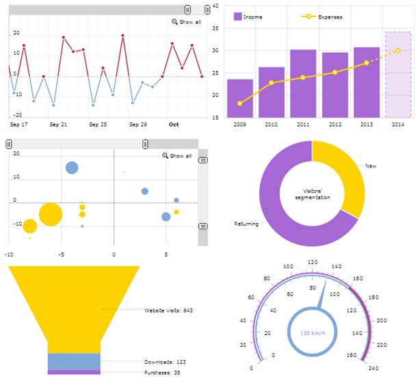 Soporta un gran número de gráficos: Column, Bar, Line, Area, Step, Step without risers, Smoothed line, Candlestick, OHLC, Pie/Donut, Radar/Polar, XY/Scatter/Bubble, Bullet, Funnel/Pyramid, Gauges.