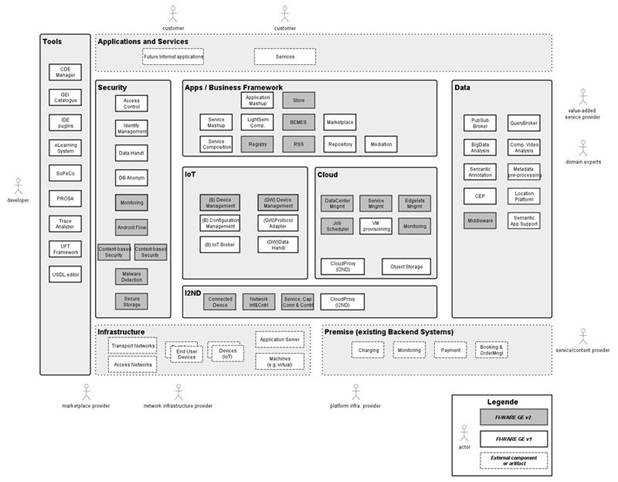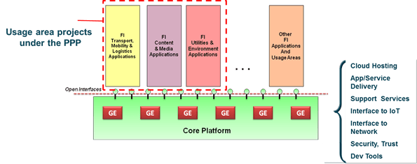 La Plataforma FI-CORE comprende un conjunto de habilitadores tecnológicos genéricos (GE: Generic Enablers) de uso general y común a varias «áreas de uso» actuales y futuros. La Plataforma FI-CORE también proporciona interfaces abiertas para el desarrollo de aplicaciones.
