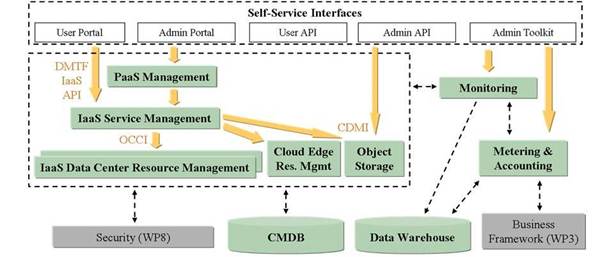 - IaaS Service Management este GE ofrece hosting de servicios compuestos, usa el GE IaaS Resource Management GE para gestionar VMs individuales. Permite comunicar con otras nubes.