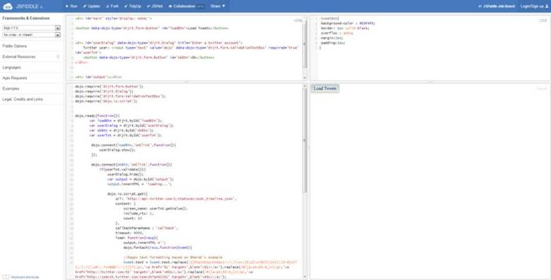 Se podrá compartir el código guardado de muy distintas formas (twitter, facebook, como una enlace al propio editor de JSFIDDLE, como el resultado a pantalla completa también en JSFIDDLE, como un iframe embebido, etc).