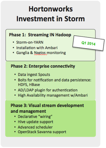 Por otro lado HortonWorks ya tiene previsto incorporar esta solución Storm-on-YARN (para el primer trimestre de 2014):