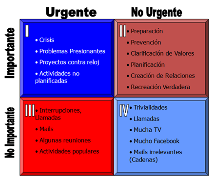 · Finalmente en el cuadrante IV están las actividades que no son ni urgentes ni importantes: tareas que nos mantienen ocupado sin lograr nada