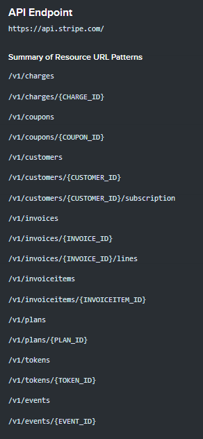 - Si nos fijamos en la de Stripes (https://stripe.com/docs/api) tenemos: