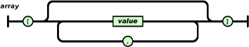 La forma más simple de mostrar datos es a través de un array, el arreglo comienza con un corchete de inicio ( [ ) y termina con un corcheta de final ( ] ) y se trata de una colección de pares nombre / valor separados por comas, como se ilustra a continuación.
