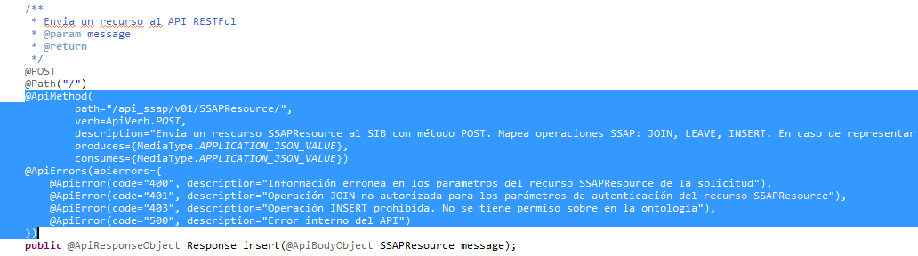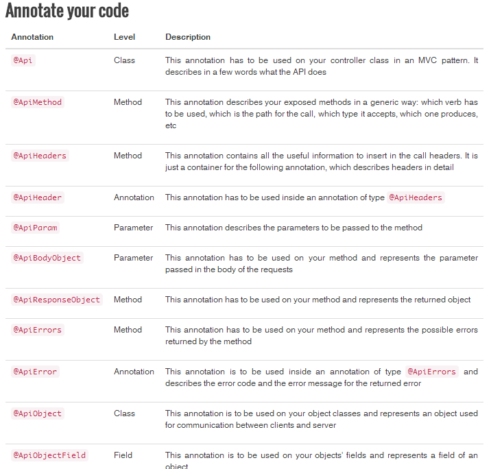 El API de JSONDoc nos da una serie de anotaciones con las que decorar la interfaz de nuestro API RESTFul, así como los objetos DTO que utilice: