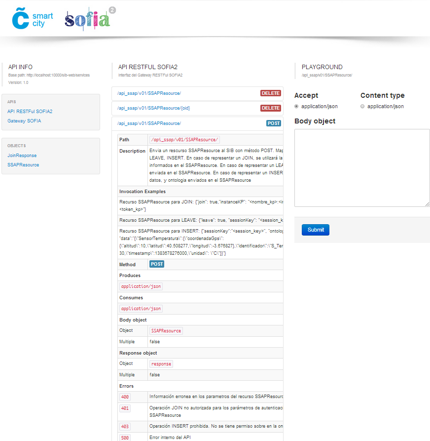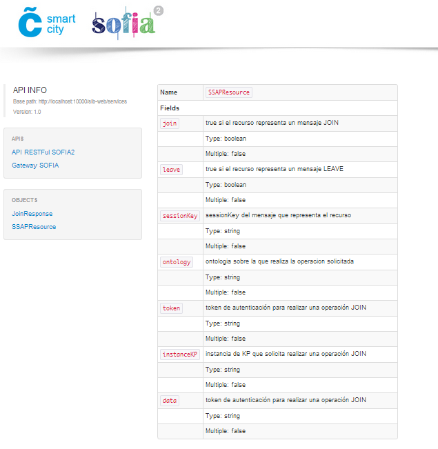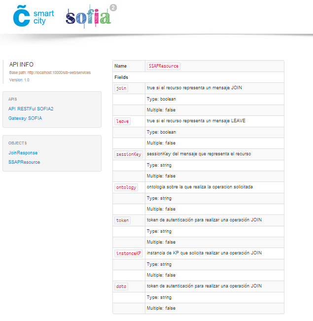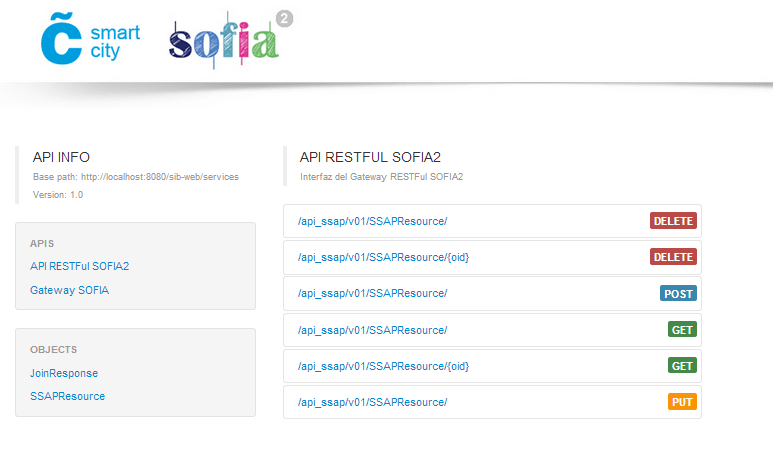 La interfaz web de documentación está compuesta por un menú donde seleccionar cada una de las APIs documentadas, asi como los DTOs de que hacen uso las APIS (sección OBJECTS).
