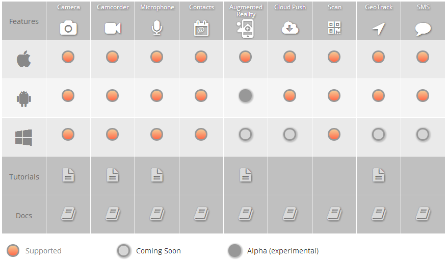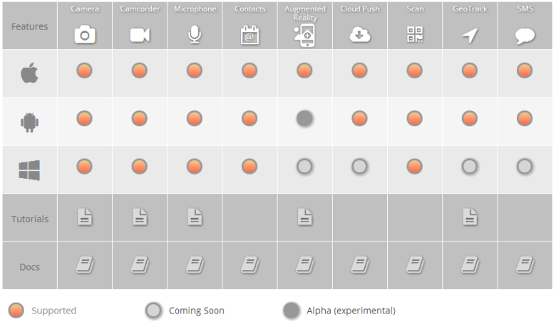 BridgeIT soporta iOS, Android y Windows Phone, y de forma native desde Javascript permite acceder a estas funcionalidades: