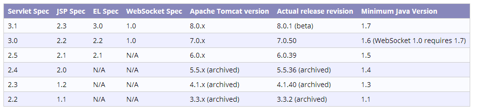 Tomcat 8 está alineado con Java EE 7, además usa las especificaciones Servlet 3.1, JSP 2.3, Expression Language 3.0, WebSocket 1.0.