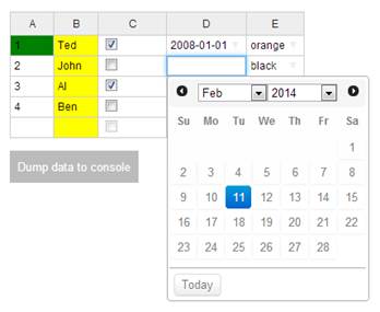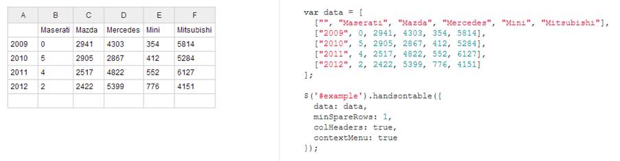 Si lo que buscáis/necesitáis es una representación tipo Excel con celdas editables una buena opción (hay más) es Handsontable que es muy sencillo de usar: