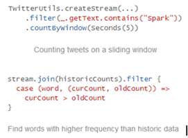 Un ejemplo sencillo e interesante: http://www.pwendell.com/2013/09/28/declarative-streams.html
