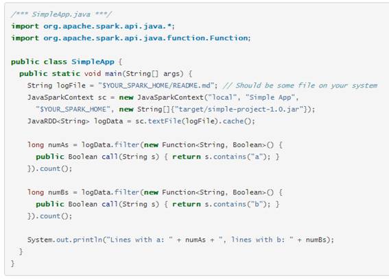 Este ejemplo cuenta el número de líneas conteniendo el texto “a” y el número de líneas conteniendo el texto “b”. Imaginaros como sería en MapReduce 😀
