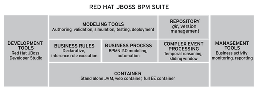 JBoss BPM Suite es una plataforma para BPM (business process management) que añade soporte para modelado, simulación, automatización, simulación y monitorización de processos de negocio, además de integración con JBoss BRMS.