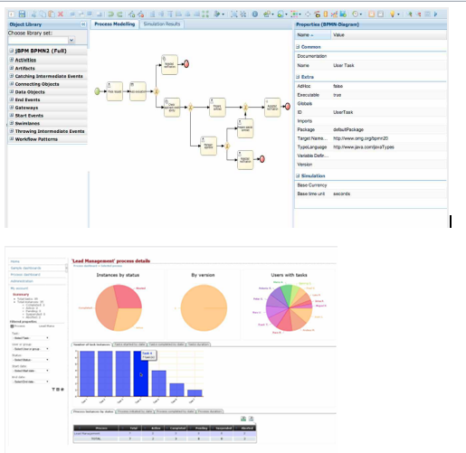 · Herramientas avanzadas para Usuario de negocio: permitiendo que los usuarios de negocio apliquen directamente su conocimiento sobre los modelos. Incluyen un modelador BPMN2 drag&drop, dashboard e informes BAM,…