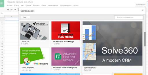 En el caso de las hojas de cálculo, ya hay disponibles add-ons que permitan eliminar celdas duplicadas, generar números aleatorios, transformar una hoja de cálculo en un diagrama de Gantt, insertar un mapa de Google en una hoja de cálculo o, incluso, integrar un diagrama de flujo con el que implementar un diagrama de Gantt a partir de los datos expuestos en una hoja de cálculo.