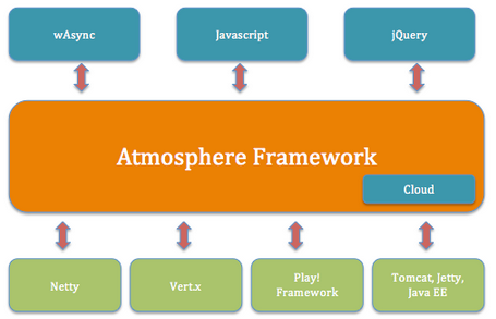 Atmosphere Framework nos ofrece componentes tanto en la Capa Servidor como Cliente para construir aplicaciones Web asíncronas, soportando WebSockets, Server Side Events (SSE), Long-Polling, HTTP Streaming (Forever frame) y JSONP.
