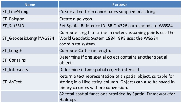 Las funciones que soporta Spatial Framework for Hadoop son: