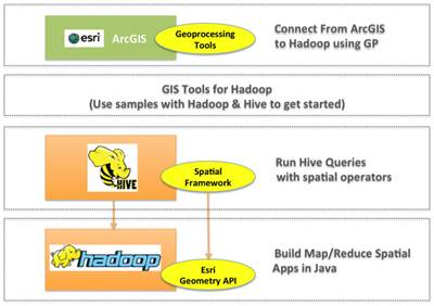 - Esri Geometry API for Java: librería geométrica que puede usarse para extender el Core de Hadoop como tipos y Operaciones geométricas permitiendo a los desarrolladores contruir aplicaciones MapReduce