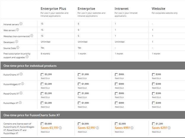 FusionCharts es una librería con diferentes tipos de licencia y coste: