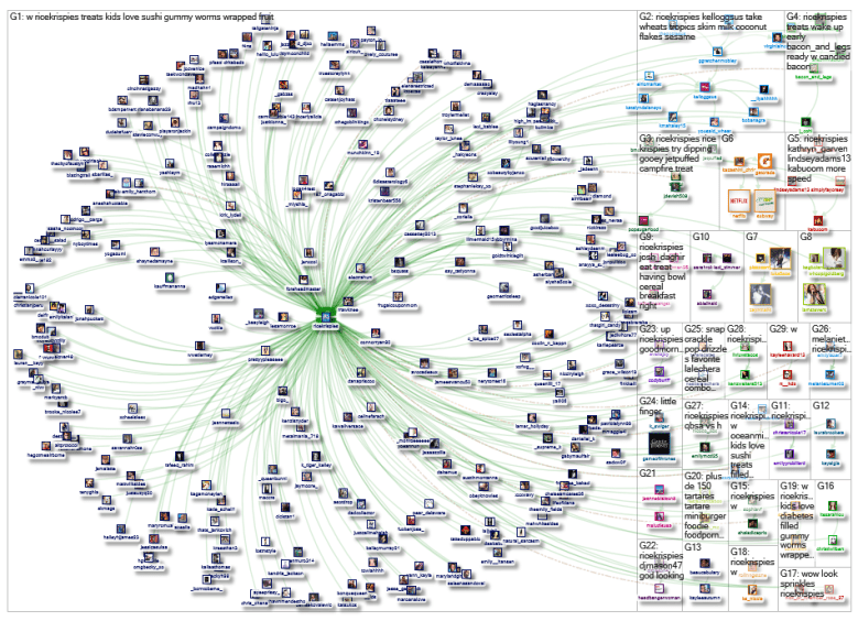 El Grafo representa una red de 311 usuarios de Twitter con tuits conteniendo "@RiceKrispies” o que respondieron o fueron mencionados en esos tuits de un dataset de 18K tuits.