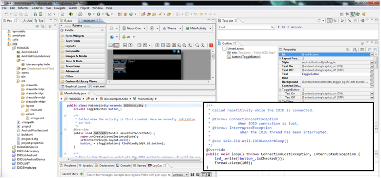 La logica de las aplicaciónes a desarrollar corre en el android y se desarrollan como apks convencionales, utilizando diversas librerias de conectividad y manipulacion de dispositivos/protocolos hardware en el IOIO, que son tratados con alto nivel de abstracion y de forma sencilla.