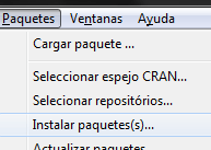 Tras esto tengo que cargar el paquete twitteR: http://cran.r-project.org/web/packages/twitteR/index.html, puedo hacerlo desde el menú de R en: