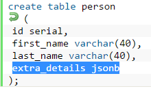 Crearemos la tabla con un campo de tipo jsonb, esto es un campo JSON binario