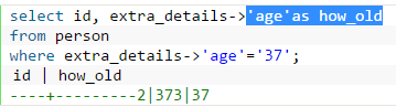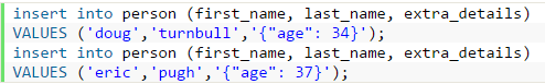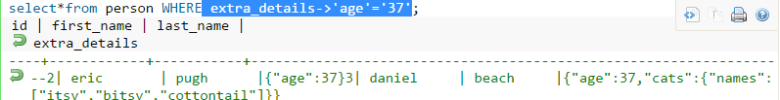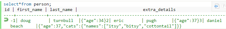 insert into person (first_name, last_name, extra_details) VALUES (‘daniel’,’beach’,’{"age": 37, "cats": {"names": ["itsy", "bitsy",