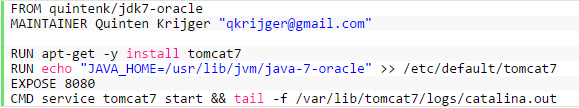 Con Docker se escriben unos ficheros de build (Dockerfile) que contienen un código de script en el que se configura un entorno, por ejemplo este sería el dockerfile de Tomcat 7: