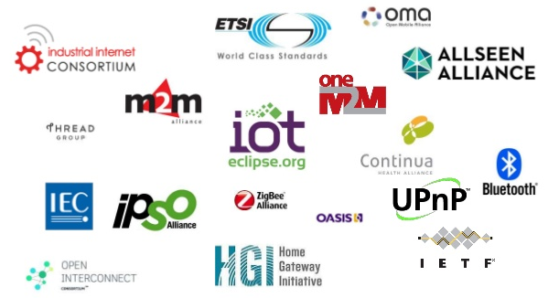 Ian analiza varios consorcios en este reciente ámbito IoT, primero incluye en un grupo a los estándares ya establecidos (Zigbee, BT LE, uPnP+) y luego a los recién llegados y dentro de estos a: