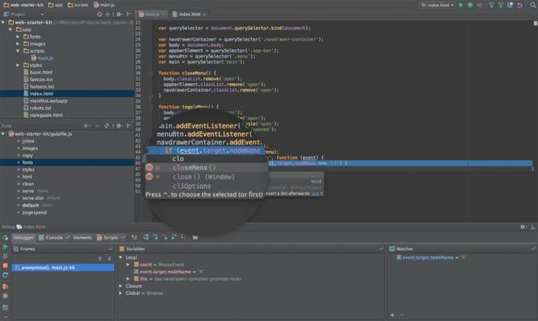 JetBrains WebStorm es el IDE para Javascript desarrollado por JetBrains (los mismos del IntelliJ).