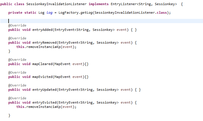 Mediante este listener, lo que pretendemos es realizar un conjunto de tareas relacionadas con la caducidad de una sesión que cada vez que elimine un elemento del mapa. Por lo que en la implementación damos cuerpo a los métodos entryRemoved y entryEvicted, que serán invocados por el API de Hazelcast cuando programáticamente se elimine una sesión del mapa (entryRemoved) o cuando se alcance el tiempo máximo de inactividad para una entrada, configurado en la declaración del mapa en el atributo max-idle-seconds (entryEvicted)