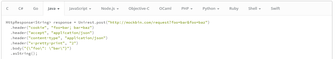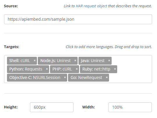 APIembed es un portal web desarrollado por Mashape que permite generar un widget HTML con el código para invocar a Servicios REST en una gran variedad de lenguajes, algo como: