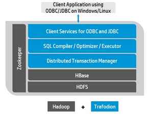 Trafodiones un proyecto open-source bajo licencia Apache 2.0 (proyecto GitHub) patrocinado por HP, creado en HP Labs que ofrece un motor SQL sobre Hadoop HBase para manejar grandes cargas de trabajo transaccionales y operacionales.