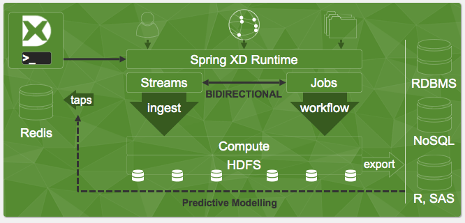 Spring XD (Spring eXtrem Data) es una Plataforma unificada, distribuida y extensible para la ingesta de datos, analítica en tiempo real, procesamiento batch y exportación de datos.