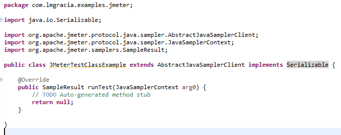 4. Creo la clase que quiero lanzar desde JMeter. En lugar de implementar el interfaz JavaSamplesClient heredaré la clase abstracta AbstractJavaSamplerClient que ya implementa la mayoría de los métodos.