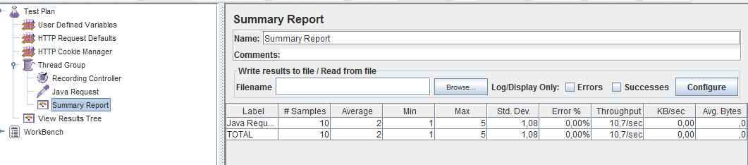 y creo un Test Plan, dentro de Thread Group pongo 10 hilos y en Muestreador Java Request: