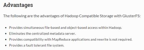 Gluster puede usarse junto a Hadoop, usando las APIs estándares de Hadoop ofreciendo estas ventajas: