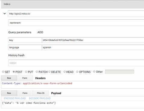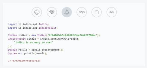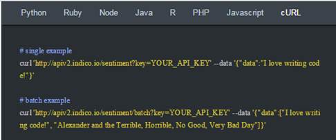 Para invocar sus servicios ofrece APIS en Python, Ruby, Node.js, Java, R, PHP, Javascript y por supuesto un API REST (https://indico.readme.io/docs/rest-api)