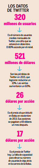 En diciembre de 2015, Twitter registró un aumento plano en el número de usuarios, un mal dato para una compañía que acaba de cumplir diez años de vida y a la que se le presuponía un éxito igual o mayor que el de Facebook. Con esta perspectiva original, Twitter protagonizó en 2013 una de las OPV más exitosas de la historia. En tres meses, sus acciones superaban los 69 dólares, un 165% más que el precio en el que se fijó en salida a Bolsa, y los inversores parecían deseosos de formar parte de la empresa que había inventado el verbo tuitear. Twitter gozaba de un gran reconocimiento, pero el mercado pronto se dió cuenta de que no era capaz de transformar a la misma velocidad su popularidad en número de usuarios.