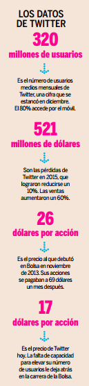 En diciembre de 2015, Twitter registró un aumento plano en el número de usuarios, un mal dato para una compañía que acaba de cumplir diez años de vida y a la que se le presuponía un éxito igual o mayor que el de Facebook. Con esta perspectiva original, Twitter protagonizó en 2013 una de las OPV más exitosas de la historia. En tres meses, sus acciones superaban los 69 dólares, un 165% más que el precio en el que se fijó en salida a Bolsa, y los inversores parecían deseosos de formar parte de la empresa que había inventado el verbo tuitear. Twitter gozaba de un gran reconocimiento, pero el mercado pronto se dió cuenta de que no era capaz de transformar a la misma velocidad su popularidad en número de usuarios.
