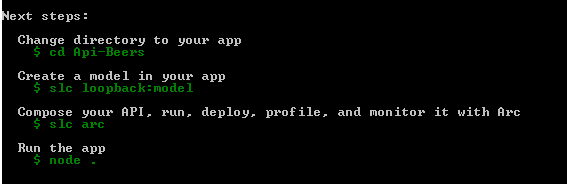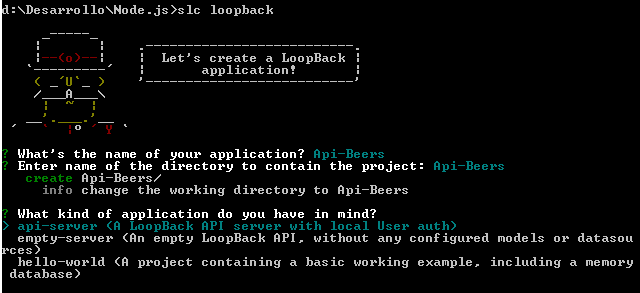 3. Una vez instalado puedo crear una aplicación LoopBak a través del interfaz de comandos (a algunos os recordará a Spring Roo :)).