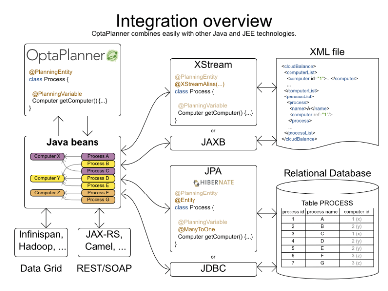OptaPlanner está pensado para integrarse y embeberse con otras tecnologías Java: