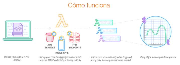 “AWS Lambda le permite ejecutar código sin aprovisionar ni administrar servidores. Solo pagará por el tiempo de cómputo que consuma – no se cobra nada cuando el código no se está ejecutando. Con Lambda, puede ejecutar código para casi cualquier tipo de aplicación o servicio back-end – y todo sin administrar nada. Usted solo tiene que cargar el código. Lambda se encargará de todo lo necesario para ejecutar y escalar el código con alta disponibilidad. Puede configurar el código para que se active automáticamente desde otros servicios de AWS o puede llamarlo directamente desde cualquier aplicación web o móvil.”