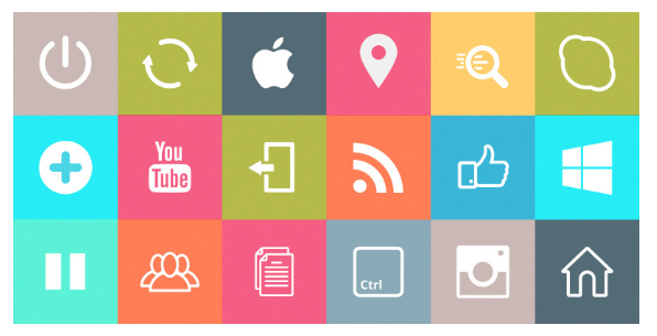 · Color: El color es un componente clave en todo diseño: Utiliza colores brillantes y que contrasten, eEl número de colores a usar en una interfaz flat design suele ser reducido y acostumbra a usarse el mismo tono con diferentes saturaciones con el fin de crear contrastes entre las imágenes, el texto y el fondo.