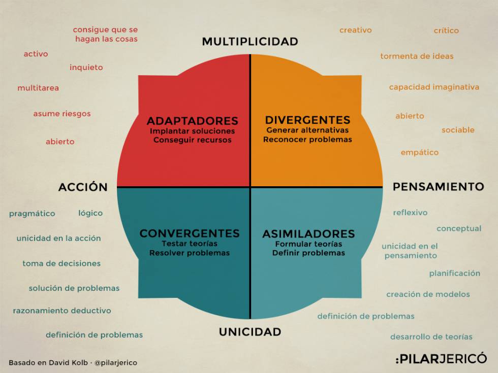 Divergentes o los reyes de las mil y una ideas creativas Disfrutan analizando los problemas en su conjunto y trabajando con personas. Son empáticos, emocionales y ocurrentes. No es de extrañar que lancen un sinfín de propuestas diferentes en una reunión. En este estilo se encuentran artistas, músicos y todos los creativos en el mundo de la empresa. Y la pregunta clave que necesitan contestar es ¿y si…? o ¿por qué no?