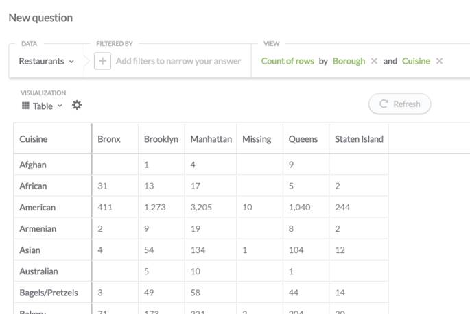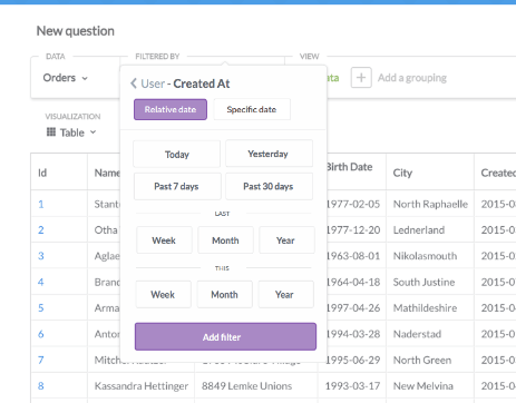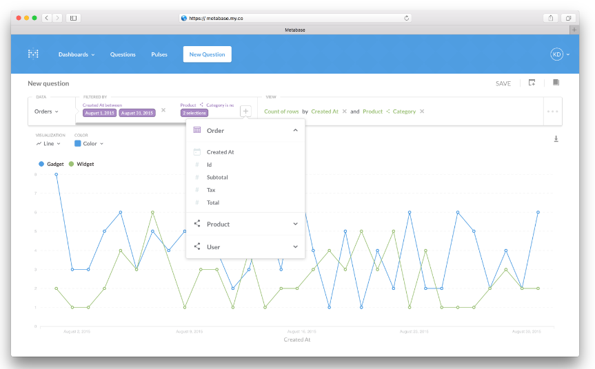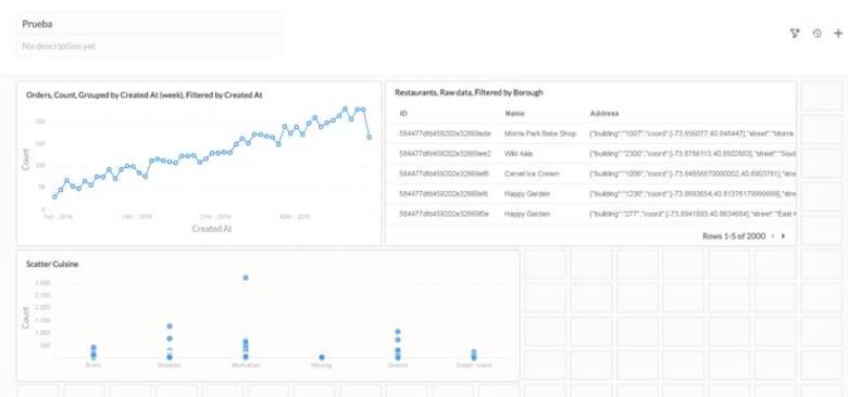 Metabase permite elegir los campos a visualizar, los filtros a aplicar, agrupaciones y la representación seleccionada, todo ello de forma visual e intuitiva: