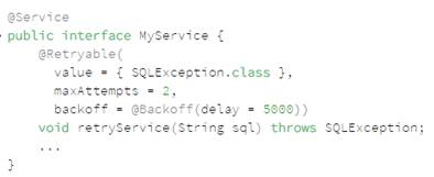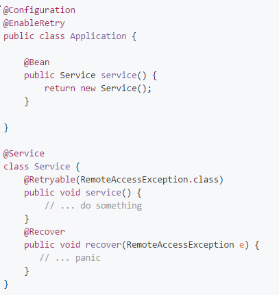 Cuando el método service lance una RemoteAccessException se reintentará la llamada (hasta 3 veces por defecto), si pasado este número de reintentos sigue la excepción entonces se invoca el método con la anotacion @Recover.
