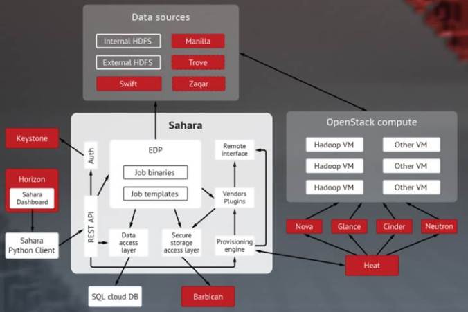 Sahara está integrado con los servicios core OpenStack como Keystone, Glance, Horizon y Nova, además soporta las APIS nativa OpenStack lo que permite a los usuarios provisionar entornos Hadoop desde el Horizon GUI.